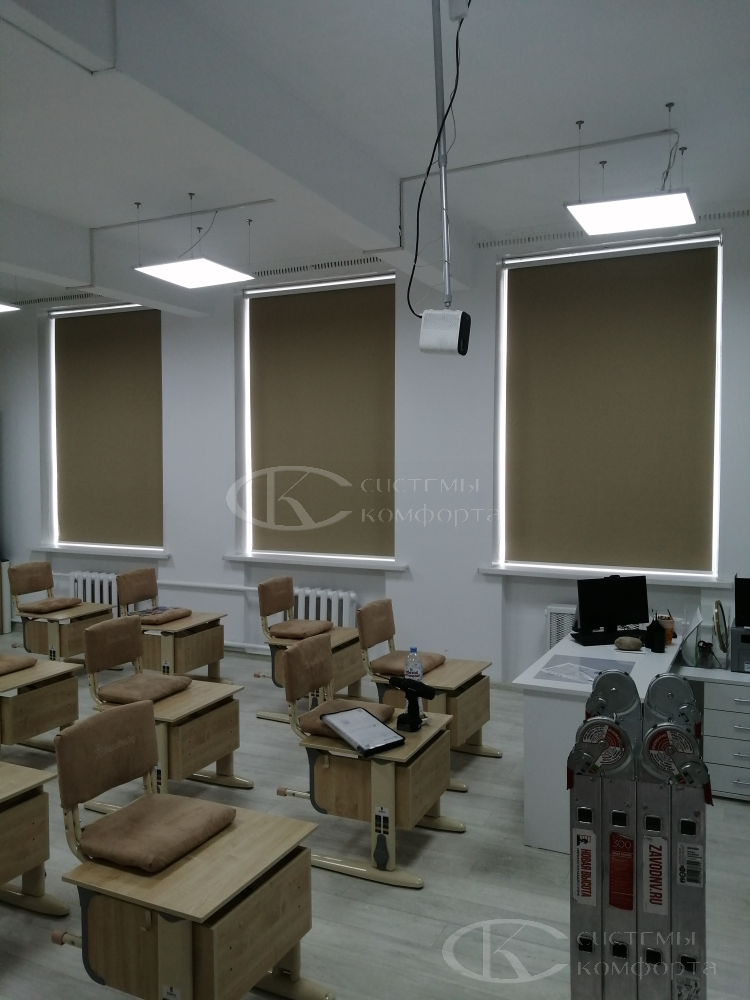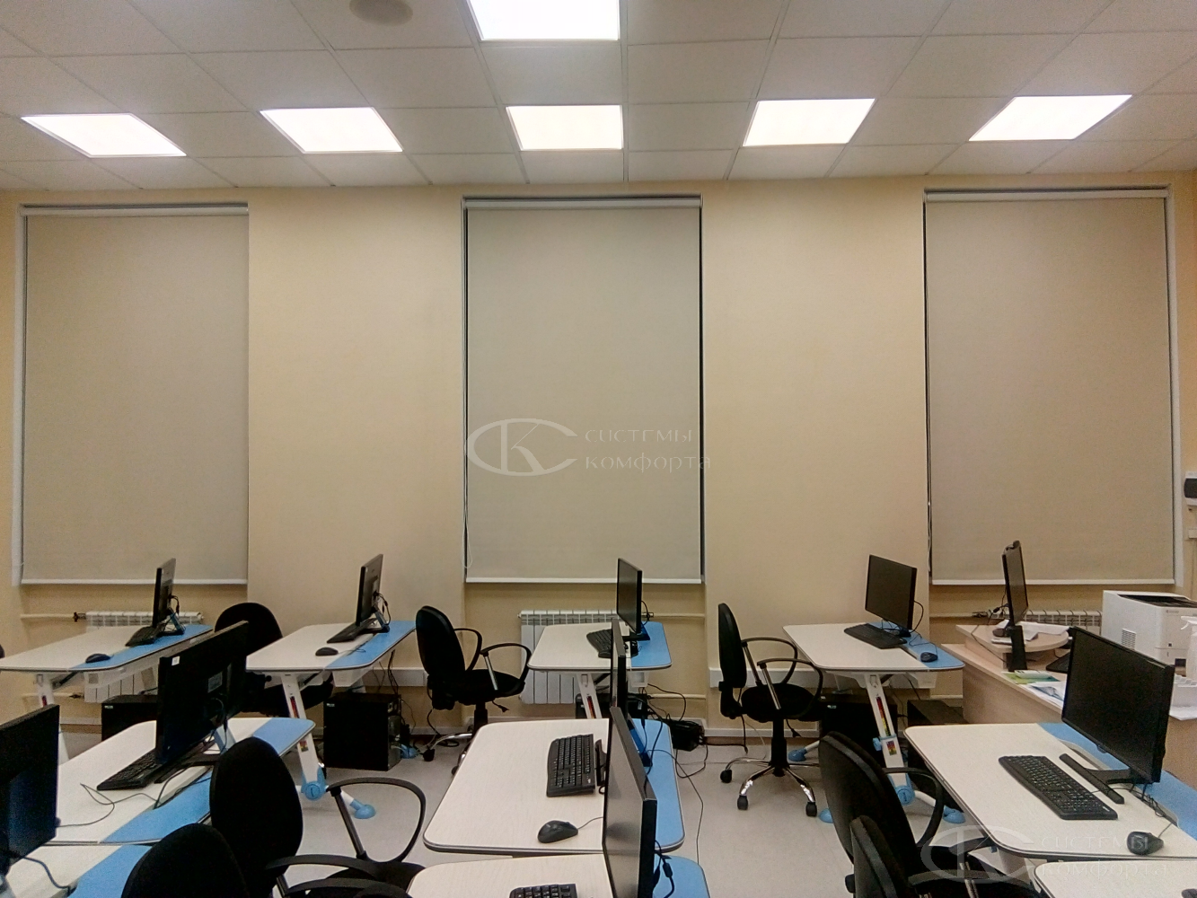Часто их называют рольшторами. Механизм работы прост: с помощью цепочки ткань поднимается и опускается. Как правило, рулонные жалюзи устанавливают на одном-двух окнах, ближайших к доске, для затемнения в классе, если часто используется в работе проектор. В этом случае рекомендуем выбрать ткань «blackout» со 100% защитой от света. Но в этом случае надо понимать, что сама по себе светонепроницаемая ткань не создает полного затемнения в классе, так как просветы в любом случае будут по краям изделия. Плюсом будет то, что ткань на этапе производства обрабатывается специальными пылеотталкивающими растворами.